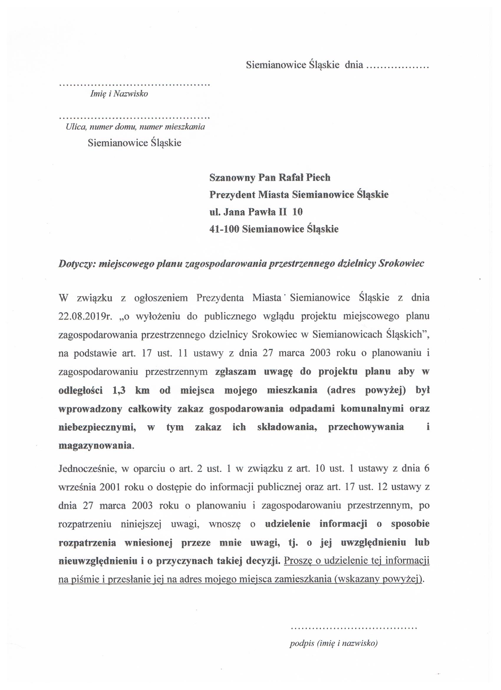 Myślę, że tym bardziej powinniśmy skupić się na informowaniu władz miasta o każdej sytuacji kiedy śmierdzi w naszej okolicy. Telefon do MCZK 32 220 05 44. Składajmy też uwagi do Prezydenta w sprawie utworzenia strefy ochronnej w odległości 1300 m od naszych mieszkań. Wniosek zamieszczam poniżej. Wystarczy wpisać imię, nazwisko i adres oraz podpisać się na dole. Wnioski składamy do kancelarii UM Siemianowice Śląskie do 8 października a więc mamy zaledwie kilka dni.